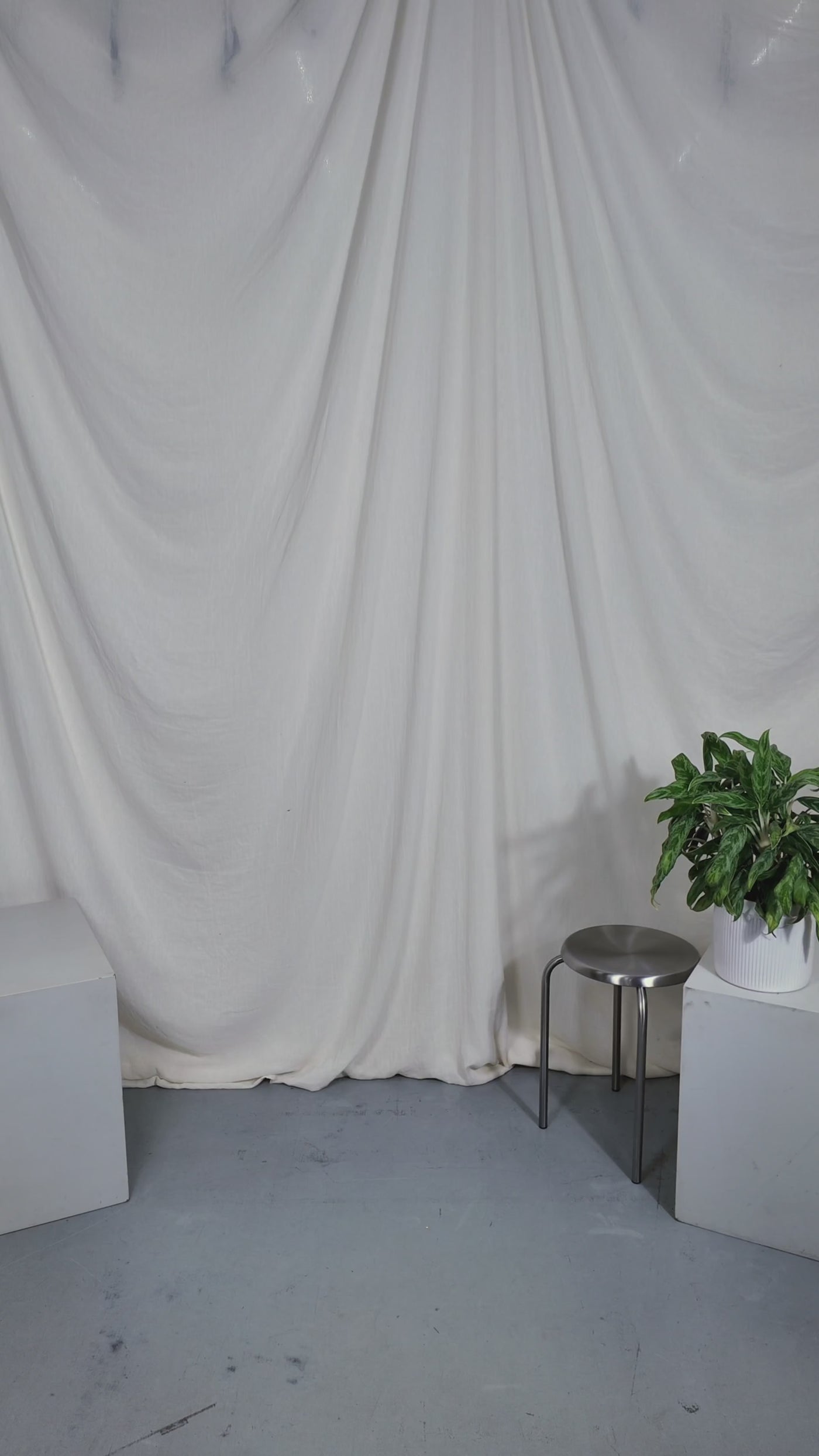 Two people sitting on a stool in a studio setting with photography equipment.